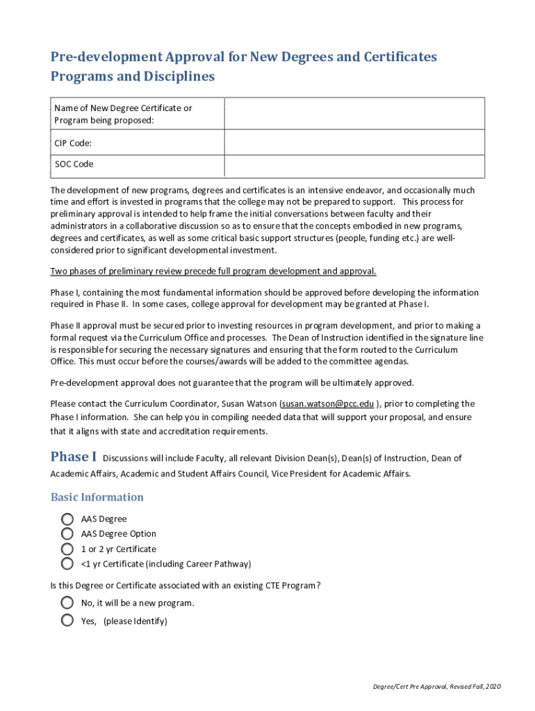 Predevelopment Approval for New Degrees and Certificates Programs and Disciplines Name of New Degree Certificate or Program being proposed: CIP Code: SOC Goethe development of new programs, degrees