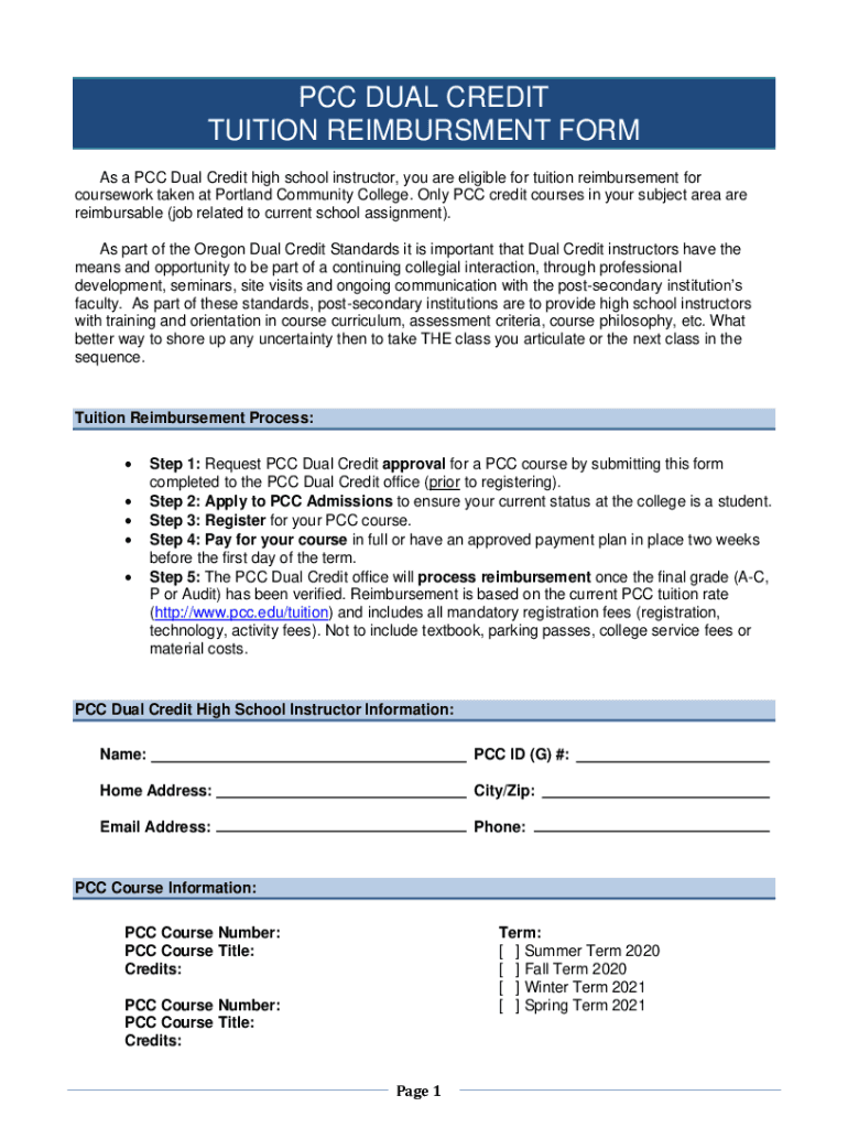 PCC DUAL CREDIT TUITION REIMBURSEMENT FORM As a PCC Dual Credit high school instructor, you are eligible for tuition reimbursement for coursework taken at Portland Community College. Only PCC credit