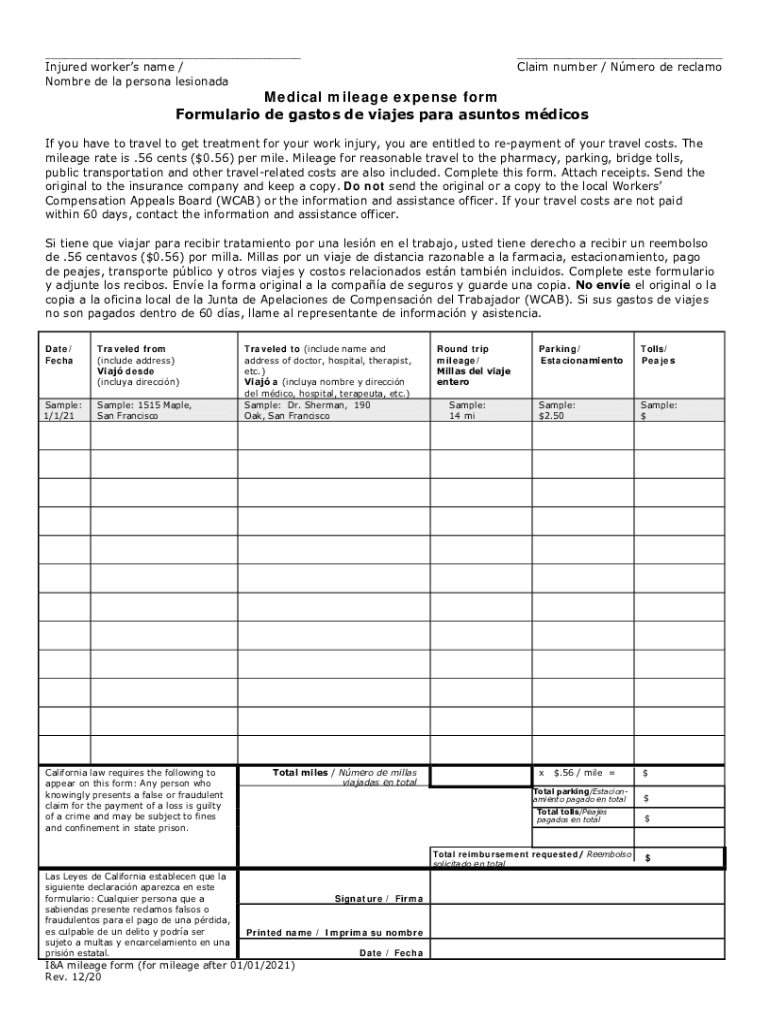 ______Claim number / Nero de reclamoInjured workers name / Hombre DE la persona lesionadaM e dicey l mile a Fee x pen SE for m Formulation de Gaston de vines para Santos medicos If you have to travel