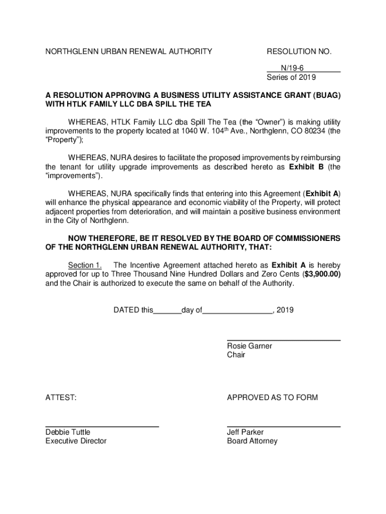 NORTHGLENN URBAN RENEWAL AUTHORITYRESOLUTION NO. N/196 Series of 2019A RESOLUTION APPROVING A BUSINESS UTILITY ASSISTANCE GRANT (BAG) WITH HULK FAMILY LLC DBA SPILL THE TEA WHEREAS, HULK Family LLC