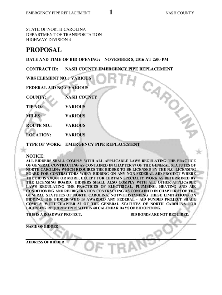 EMERGENCY PIPE REPLACEMENT1NASH COUNTYSTATE OF NORTH CAROLINA