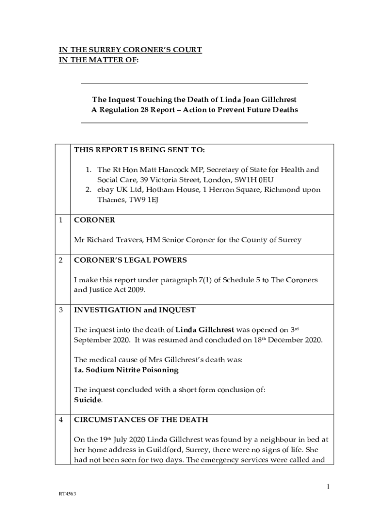 IN THE SURREY CORONERS COURT IN THE MATTER OF: ___ The Inquest Touching the Death of Linda Joan Gilchrist A Regulation 28 Report Action to Prevent Future Deaths ___THIS REPORT IS BEING SENT TO: 1.