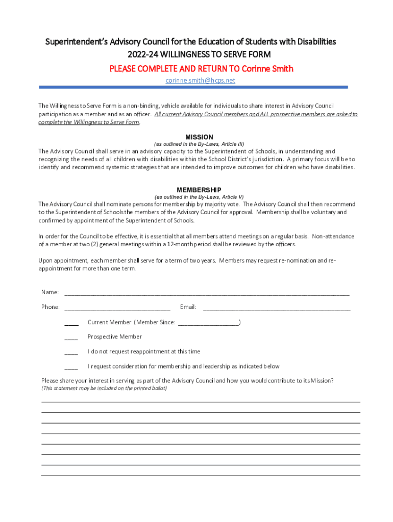 Superintendents Advisory Council for the Education of Students with Disabilities 202224 WILLINGNESS TO SERVE FORM PLEASE COMPLETE AND RETURN TO Corinne Smith corinne.smith@hcps.net The Willingness