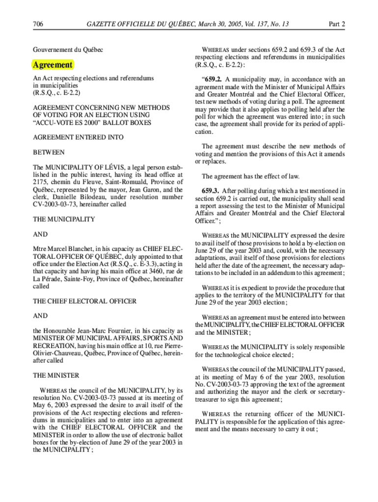 706GAZETTE OFFICIALLY DU QUEBEC, March 30, 2005, Vol. 137, No. 13Gouvernement Du QubecAgreement An Act respecting elections and referendums in municipalities (R.S.Q., c. E2.2) AGREEMENT CONCERNING