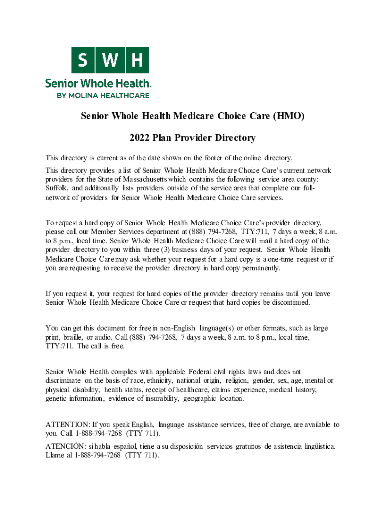 Senior Whole Health Medicare Choice Care (HMO) 2022 Plan Provider Directory This directory is current as of the date shown on the footer of the online directory. This directory provides a list of