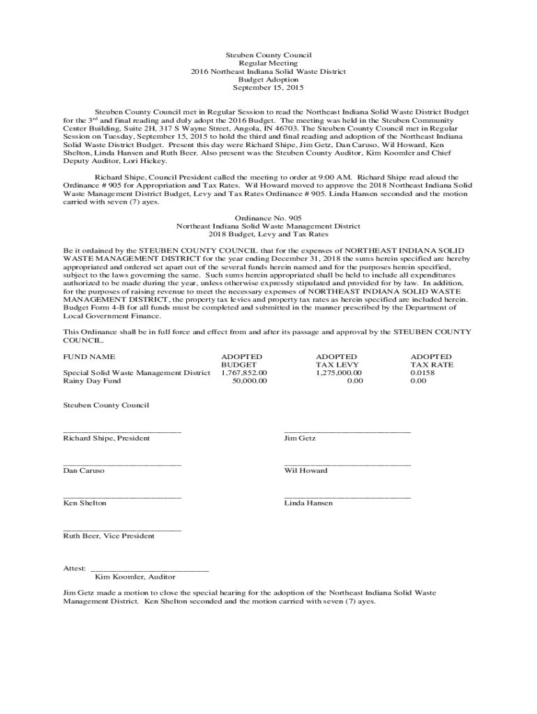 Steuben County Council Regular Meeting 2016 Northeast Indiana Solid Waste District Budget Adoption September 15, 2015Steuben County Council met in Regular Session to read the Northeast Indiana Solid
