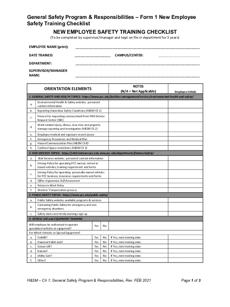 General Safety Program & Responsibilities Form 1 New Employee Safety Training Checklist NEW EMPLOYEE SAFETY TRAINING CHECKLIST(To be completed by supervisor/manager and kept on file in department