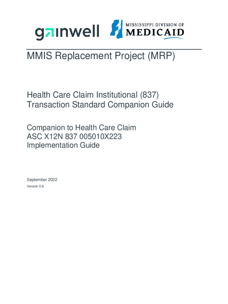 MMS Replacement Project (MRP)Health Care Claim Institutional (837) Transaction Standard Companion Guide Companion to Health Care Claim ASC X12N 837 005010×223 Implementation Guide September 2022