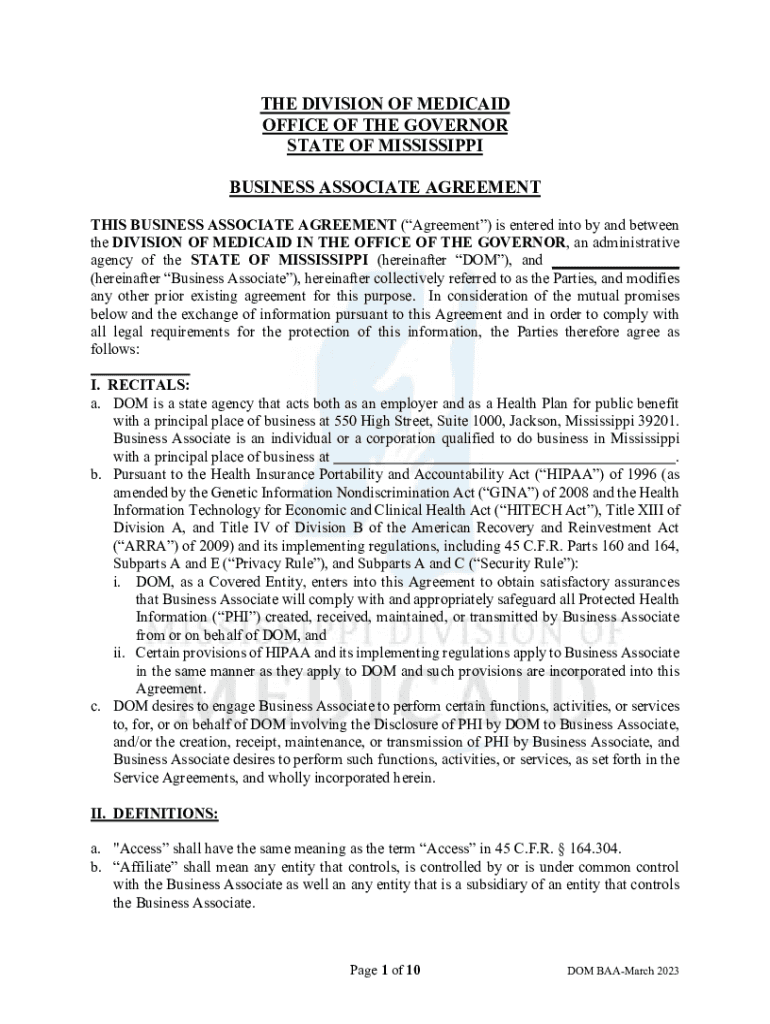 THE DIVISION OF MEDICAID OFFICE OF THE GOVERNOR STATE OF MISSISSIPPI BUSINESS ASSOCIATE AGREEMENT THIS BUSINESS ASSOCIATE AGREEMENT (Agreement) is entered into by and between the DIVISION OF MEDICAID