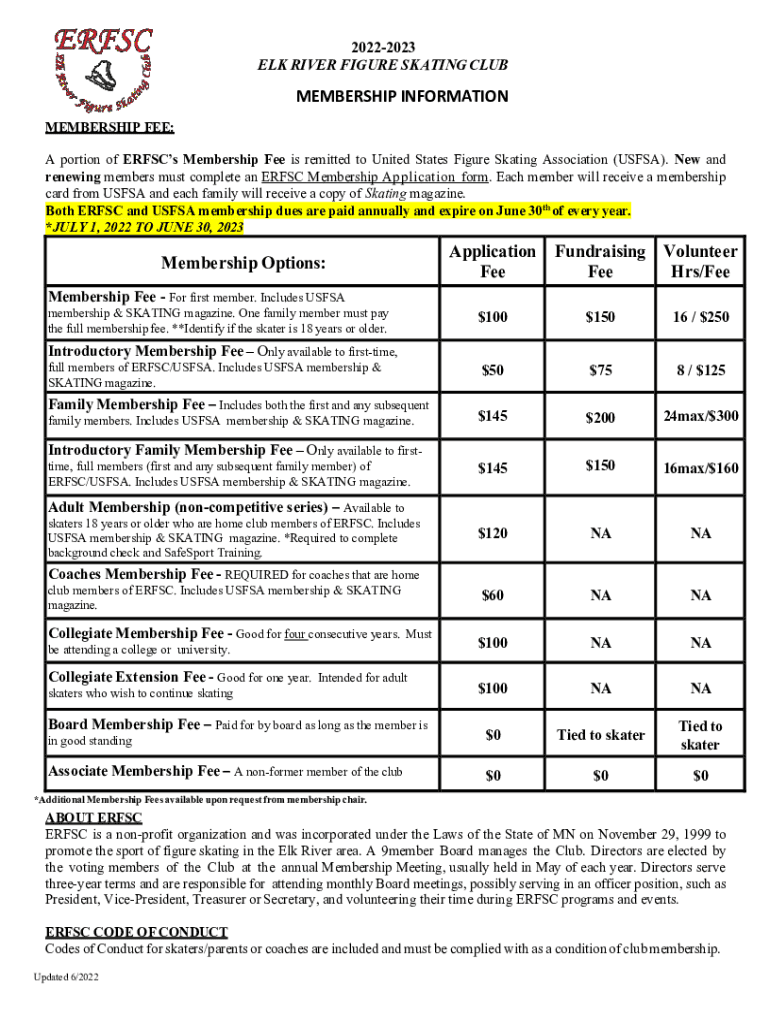 20222023 ELK RIVER FIGURE SKATING CLUBMEMBERSHIP INFORMATION MEMBERSHIP FEE: A portion of Erases Membership Fee is remitted to United States Figure Skating Association (US FSA). New and renewing members