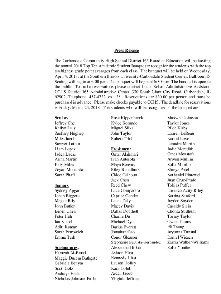 Press Release The Carbondale Community High School District 165 Board of Education will be hosting the annual 2018 Top Ten Academic Student Banquet to recognize the students with the top ten highest