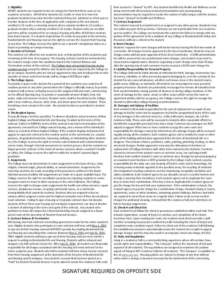 1. Eligibility All NEC students are required to live on campus for their first three years or six academic semesters. All full time students (12 credits or more 8 or more for graduate students) may