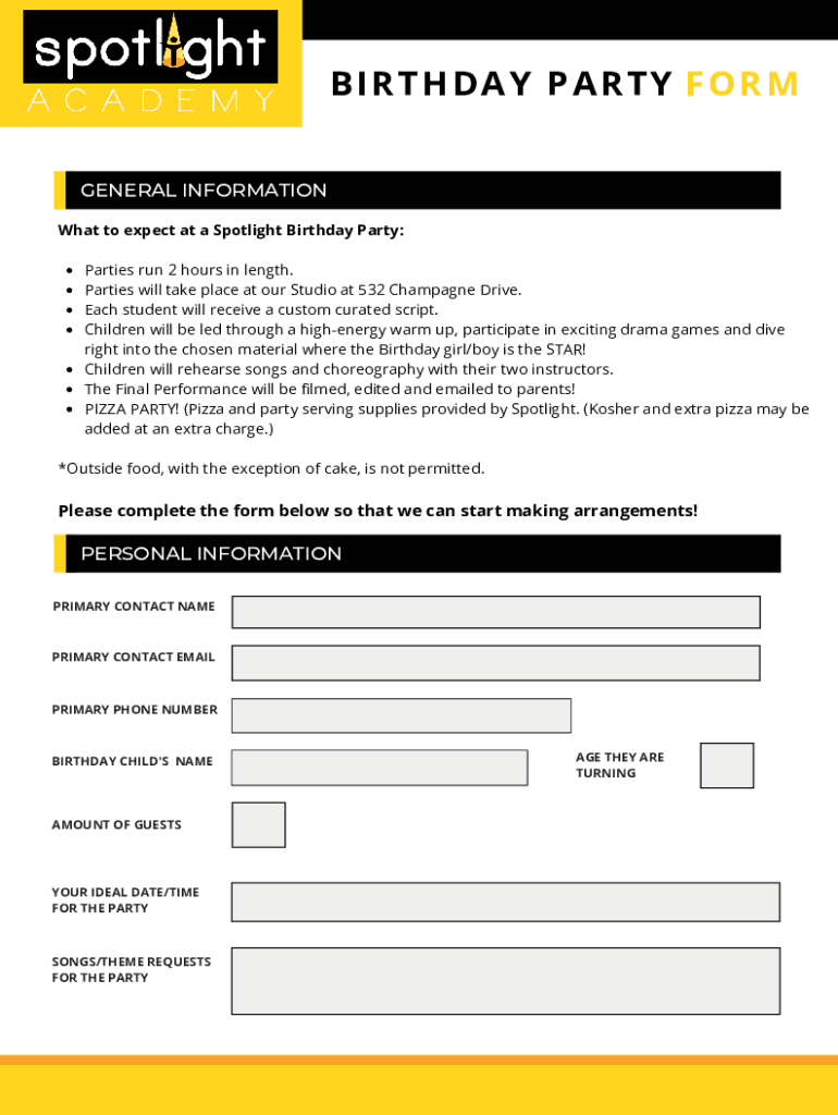 BIRTHDAY PARTY FORM INSTRUCTIONS Thank you for your interest in a Spotlight Birthday Party! Please DOWNLOAD this PDF and fill out all form fields and submit the PDF as an attachment to: admin@spotlightacademyto.com