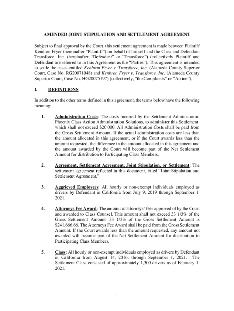 AMENDED JOINT STIPULATION AND SETTLEMENT AGREEMENT Subject to final approval by the Court, this settlement agreement is made between Plaintiff Tendon Fryer (hereinafter Plaintiff) on behalf of himself