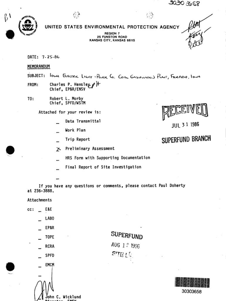 3030dbSXUNITED STATES ENVIRONMENTAL PROTECTION AGENCY REGION 7 25 FUNCTION ROAD KANSAS CITY, KANSAS 66115DATE:72S6GMEMORANDUM SUBJECT:IovaaFROM:Charles P. Hensley, /If\” Chief, TO:LA.VT Poor. Co.