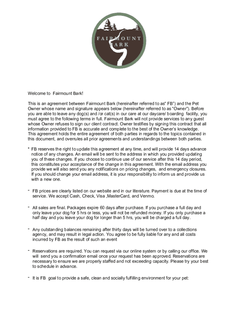 Welcome to Fairmount Bark! This is an agreement between Fairmount Bark (hereinafter referred to as FB) and the Pet Owner whose name and signature appears below (hereinafter referred to as Owner).