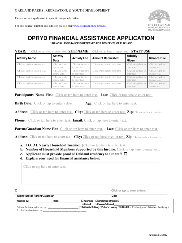OAKLAND PARKS, RECREATION, & YOUTH DEVELOPMENT Please submit application to specific program location For site contact number and address please visit www.oaklandnet.com/parksOPRYD FINANCIAL ASSISTANCE