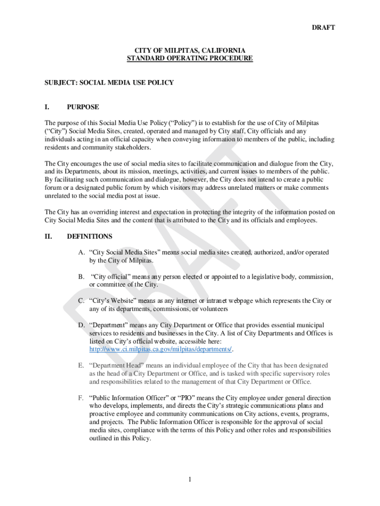 DRAFT CITY OF MILPITAS, CALIFORNIA STANDARD OPERATING PROCEDURESUBJECT: SOCIAL MEDIA USE POLICY. Purpose of this Social Media Use Policy (Policy) is to establish for the use of City of Milpitas (City)