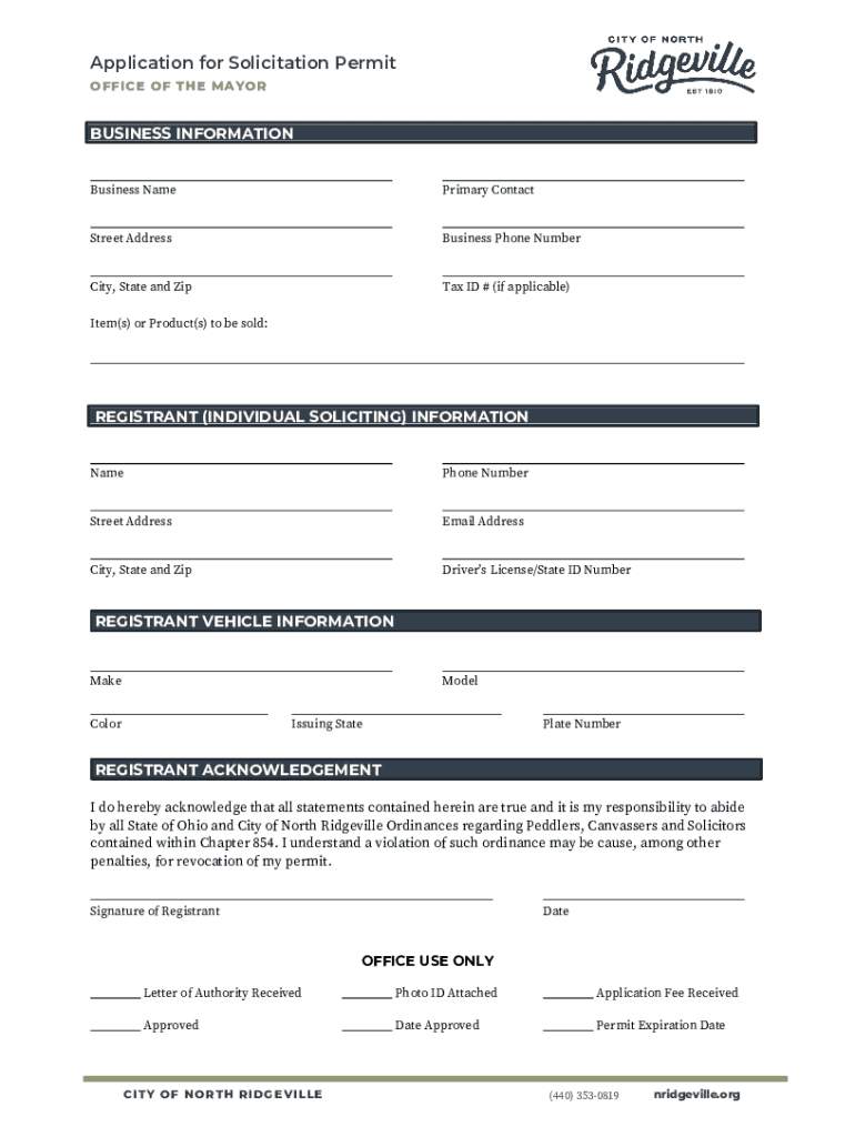 Application for Solicitation Permit OFFICE OF THE Mayoresses and Regulations for Obtaining a Solicitation Permit All persons requesting a solicitor permit must have the following items submitted to