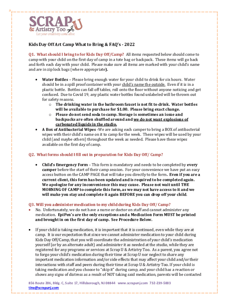 Kids Day Off Art Camp What to Bring & FAQs 2022 Q1. What should I bring to for Kids Day Off/Camp? All items requested below should come to camp with your child on the first day of camp in a tote bag
