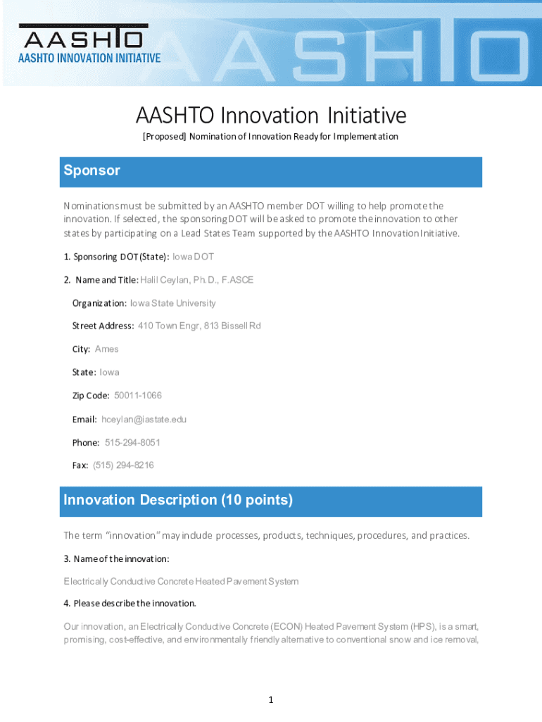 AAS HTO Innovation Initiative [Proposed] Nomination of Innovation Ready for ImplementationSponsor Nominations must be submitted by an AAS HTO member DOT willing to help promote the innovation. If