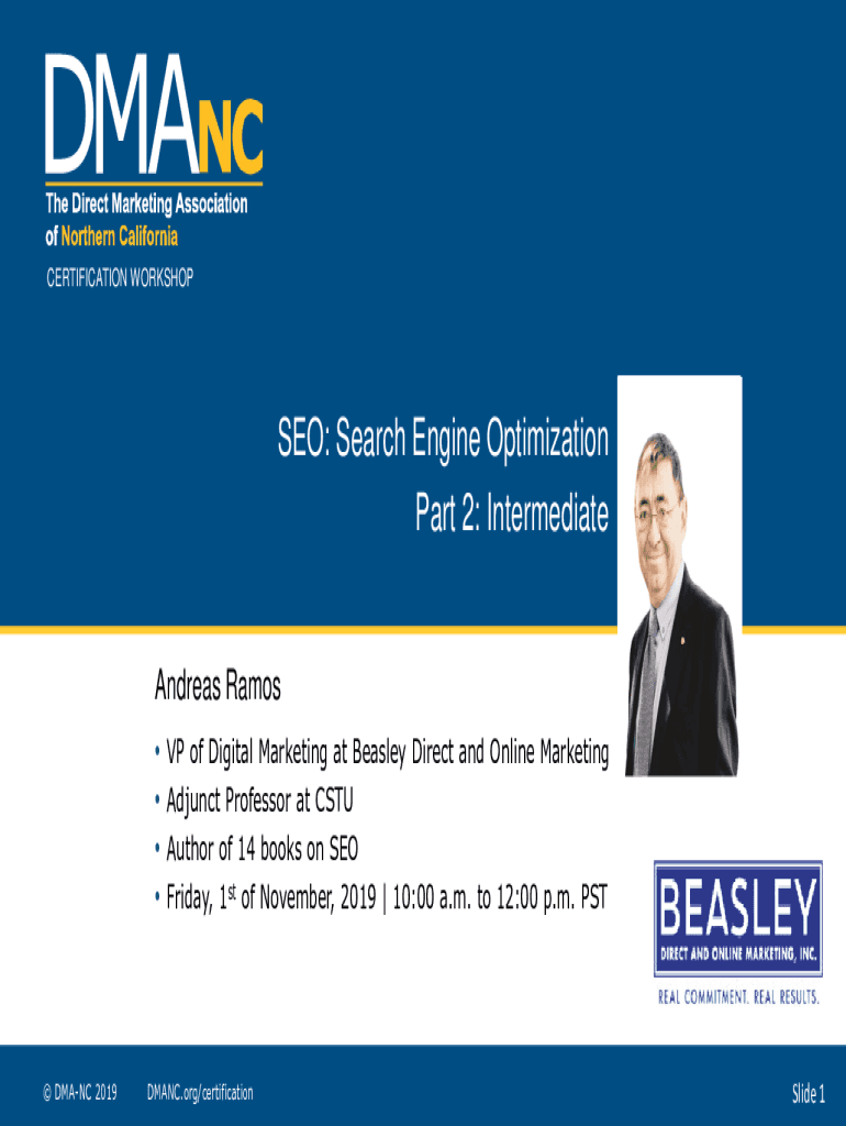 CERTIFICATION WORKSHOP SEO: Search Engine Optimization Part 2: Intermediate Andreas Ramos DMAIC 2019VP of Digital Marketing at Beasley Direct and Online Marketing Adjunct Professor at CSU Author of