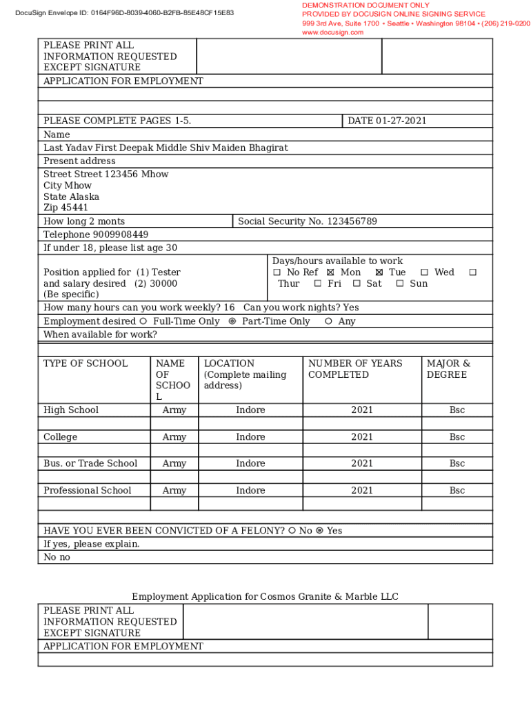 DEMONSTRATION DOCUMENT ONLY PROVIDED BY DocuSign ONLINE SIGNING SERVICE 999 3rd Ave, Suite 1700 Seattle Washington 98104 (206) 2190200 www.docusign.comDocuSign Envelope ID: 0164F96D80394060B2FB85E48CF15E83PLEASE