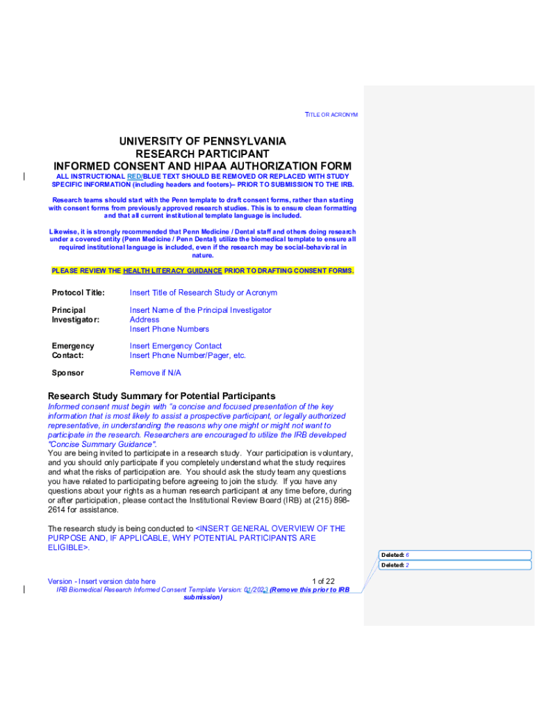 TITLE OR ACRONYMUNIVERSITY OF PENNSYLVANIA RESEARCH PARTICIPANT INFORMED CONSENT AND HIPAA AUTHORIZATION FORMAL INSTRUCTIONAL RED/BLUE TEXT SHOULD BE REMOVED OR REPLACED WITH STUDY SPECIFIC INFORMATION