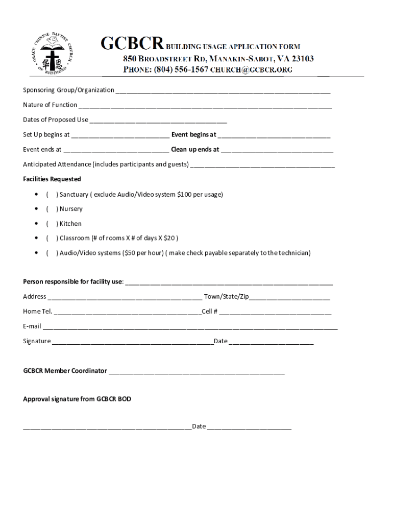 Sponsoring Group/Organization ___ Nature of Function ___ Dates of Proposed Use ___ Set Up begins at ___ Event begins at ___ Event ends at ___ Clean up ends at ___ Anticipated Attendance (includes