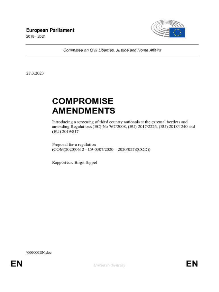 European Parliament 2019 2024Committee on Civil Liberties, Justice and Home Affairs27.3.2023COMPROMISE AMENDMENTS Introducing a screening of third country nationals at the external borders and amending