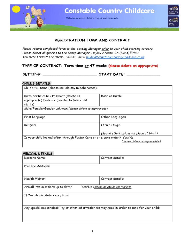 Constable Country Childcare CONSTABLE COUNTRY CHILDCARE REGISTRATION FORM AND CONTRACT Please return completed form to the Setting Manager prior to your child starting nursery. Please direct all queries