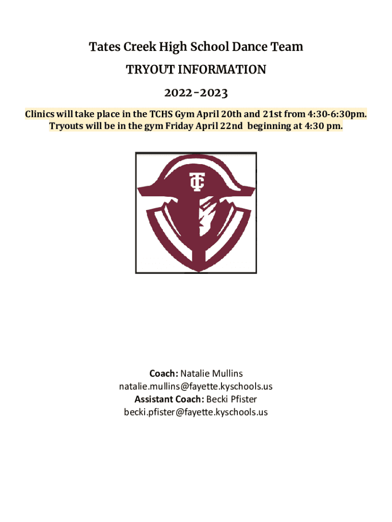 Tate's Creek High School Dance Team TRYOUT INFORMATION 20222023 Clinics will take place in the TCHS Gym April 20th and 21st from 4:306:30pm. Tryouts will be in the gym Friday, April 22nd beginning