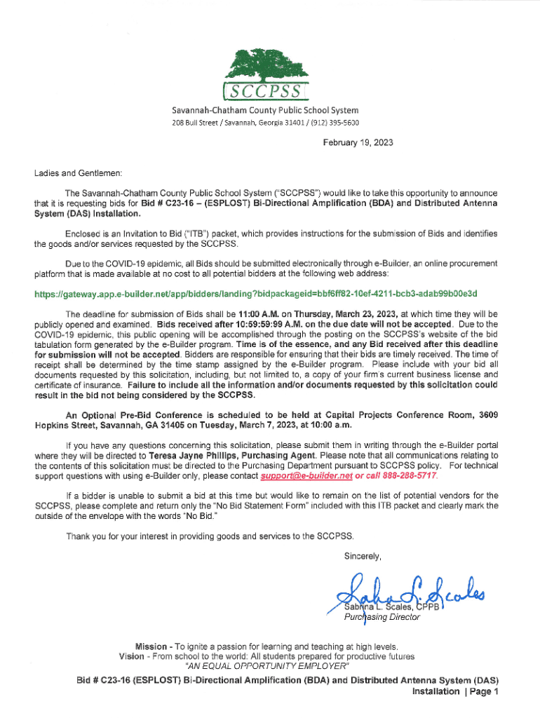 INVITATION TO BID (ITB): #C2316 (EXPLOIT) Bidirectional Amplification (BDA) and Distributed Antenna System (WAS) Installation I. INTRODUCTION The Board of Public Education for the City of Savannah