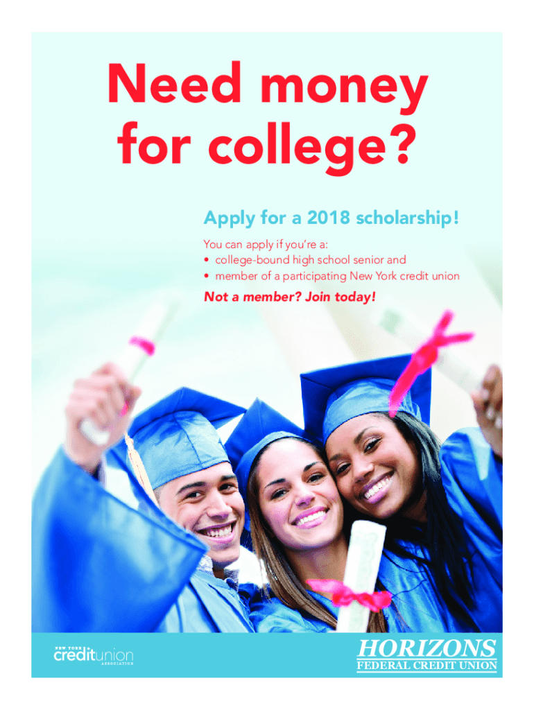 Need money for college? Apply for a 2018 scholarship! You can apply if you're a: college bound high school senior and member of a participating New York credit Unionist a member? Join today!HORIZONSFEDERAL