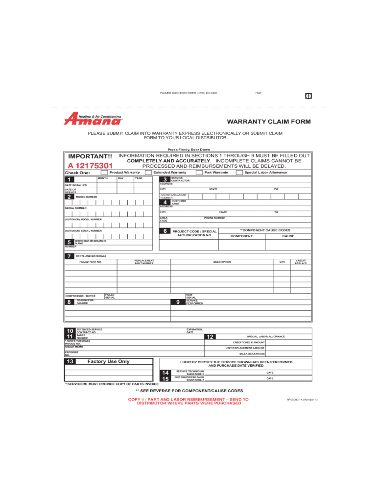 PALMER BUSINESS FORMS (832) 43704957841Heating & Air ConditioningWARRANTY CLAIM FORM PLEASE SUBMIT CLAIM INTO WARRANTY EXPRESS ELECTRONICALLY OR SUBMIT CLAIM FORM TO YOUR LOCAL DISTRIBUTOR. Press
