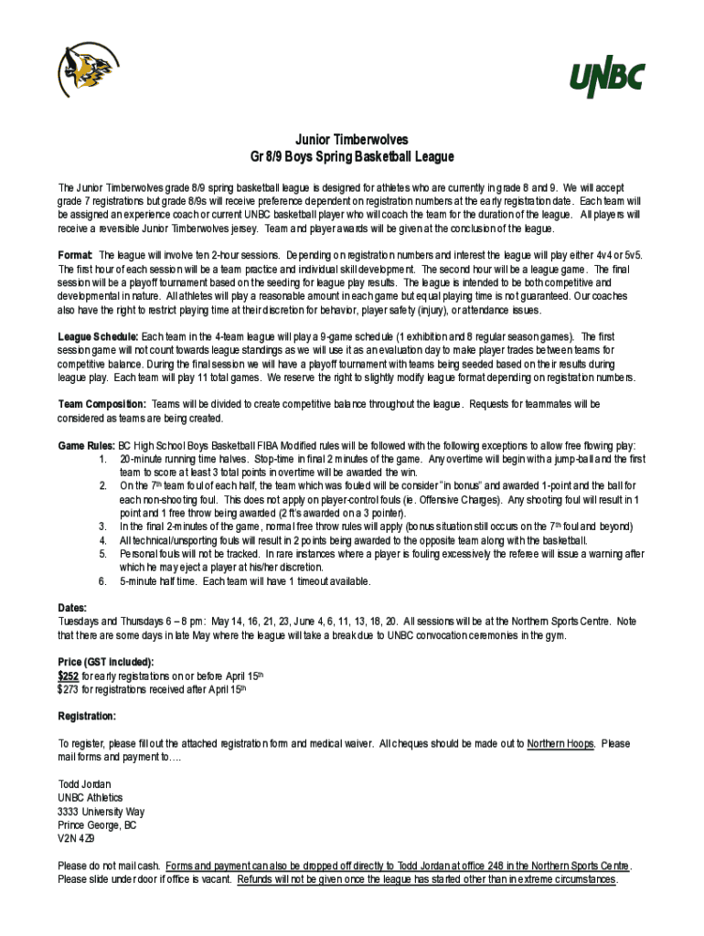 Gr 8/9 Boys Spring Basketball League Junior Timberwolves grade 8/9 spring basketball league is designed for athletes who are currently in grade 8 and 9. We will accept
