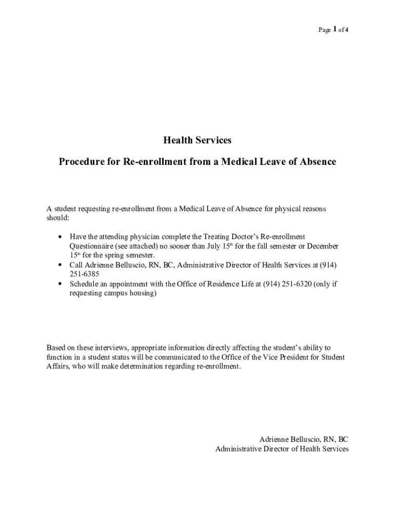 Page 1 of 4Health Services Procedure for Re enrollment from a Medical Leave of Absence student requesting reenrollment from a Medical Leave of Absence for physical reasons should: Have the attending