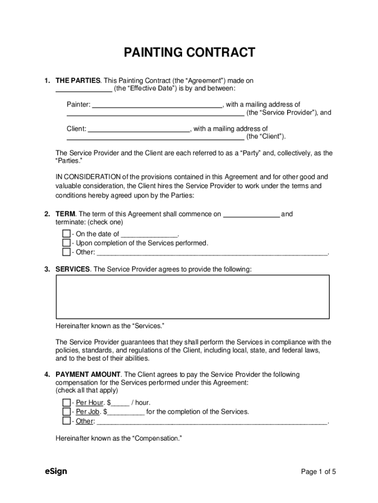 PAINTING CONTRACT 1. THE PARTIES. This Painting Contract (the Agreement) made on (the Effective Date) is by and between: Painter:Client:, with a mailing address of (the Service Provider), and, with