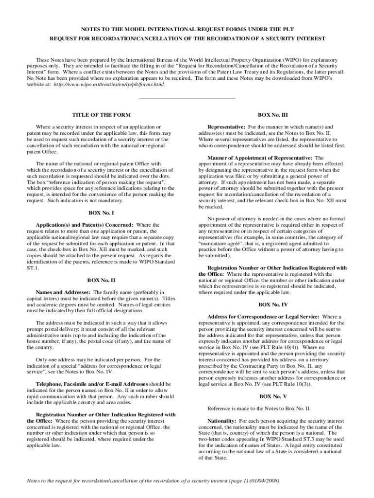 NOTES TO THE MODEL INTERNATIONAL REQUEST FORMS UNDER THE PLT REQUEST FOR DECORATION/CANCELLATION OF THE DECORATION OF A SECURITY INTERESTThese Notes have been prepared by the International Bureau
