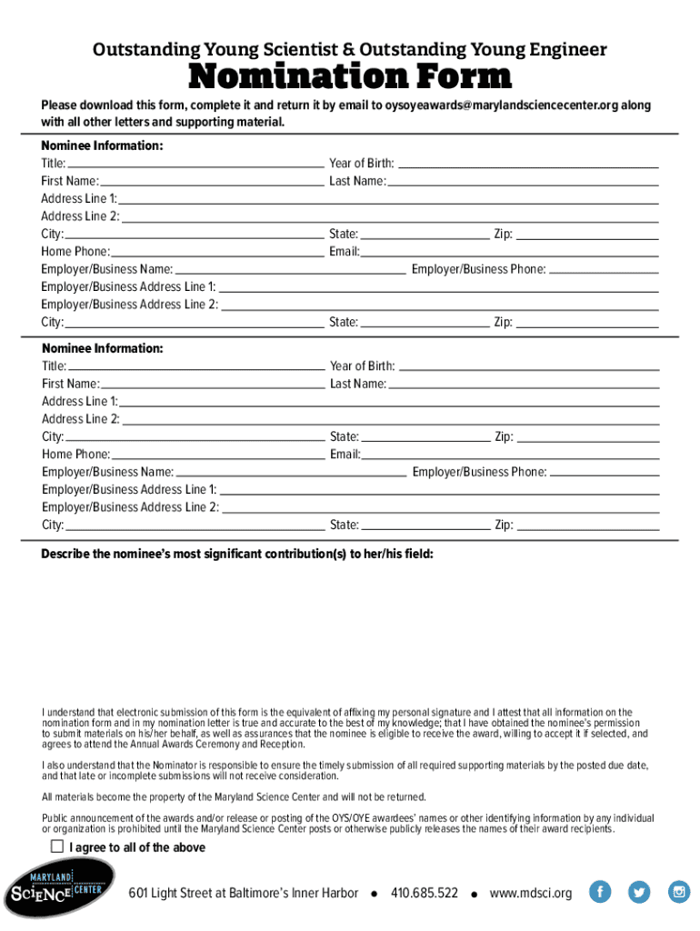 Outstanding Young Scientist & Outstanding Young EngineerNomination Formulas download this form, complete it and return it by email to oysoyeawards@marylandsciencecenter.org along with all other letters