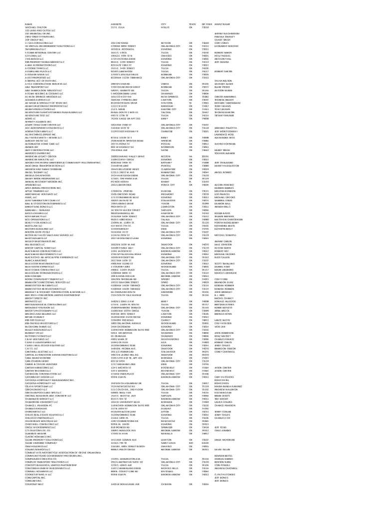 NAME MICHAEL CHILTON 132 LAND AND CATTLE LLC 1ST FINANCIAL OK INC. 23RD STREET FITNESS INC. 2GP GROUP INC. 3 J GAS CONSULTING LLC 3D VIRTUAL ENVIRONMENT SOLUTIONS LLC 3M MINERALS LLC 5 STARR REGIONAL