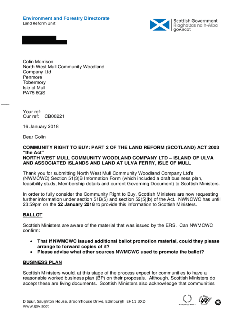 Environment and Forestry Directorate Land Reform Unit Colin Morrison North West Mull Community Woodland Company Ltd Kenmore Tobermory Isle of Mull PA75 6QS___ Your ref: Our ref: CB00221 16 January