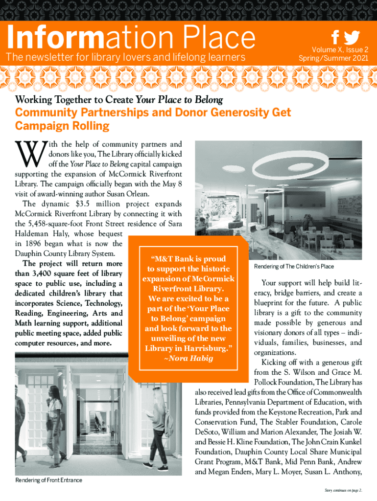 Information Place The newsletter for library lovers and lifelong learnersVolume X, Issue 2 Spring/Summer 2021Working Together to Create Your Place to BelongCommunity Partnerships and Donor Generosity