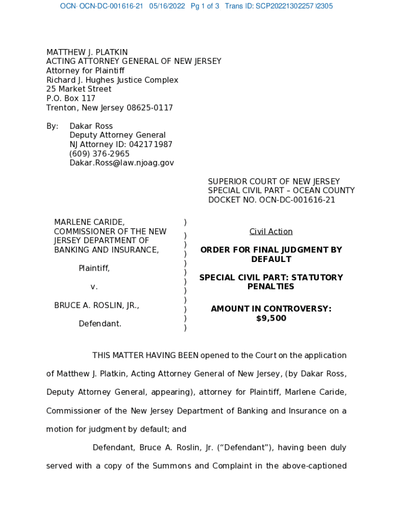 OCNDC00161621 04/08/2022 05/16/2022 11:45:28 Pam 1 of Pg 3 1Trans of 3 ID: Trans SCP20221302257 ID: SCP2022902305MATTHEW J. PLAT KIN ACTING ATTORNEY GENERAL OF NEW JERSEY Attorney for Plaintiff Richard