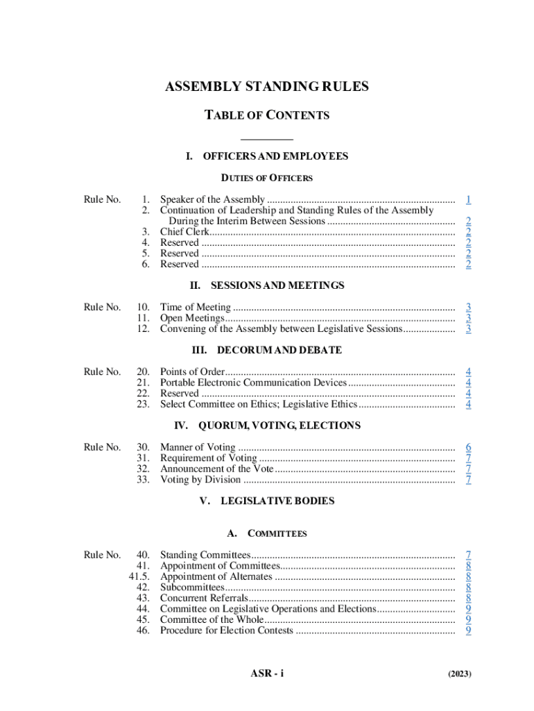 ASSEMBLY STANDING RULES TABLE OF CONTENTS ___ I.OFFICERS AND EMPLOYEES DUTIES OF OFFICERSRule No.1. 2. 3. 4. 5. 6. Speaker of the Assembly ........................................................................