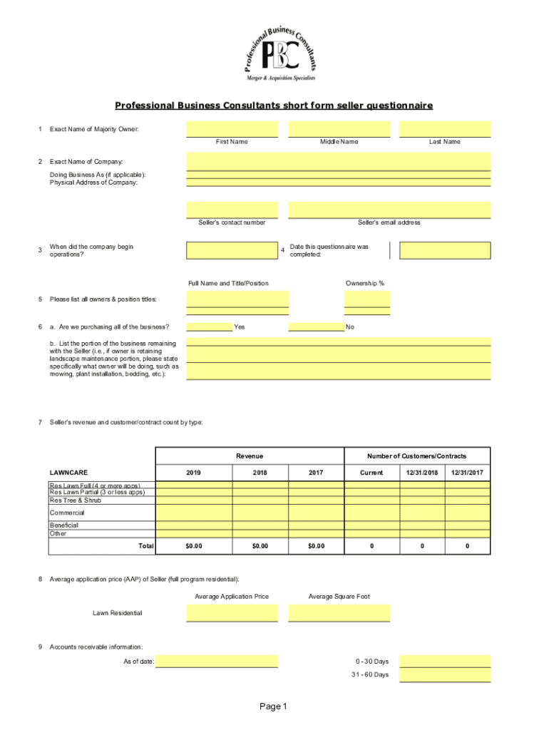 Professional Business Consultants short form seller questionnaire 1Exact Name of Majority Owner: First Name2Middle Nameless Namespace Name of Company: Doing Business As (if applicable): Physical Address
