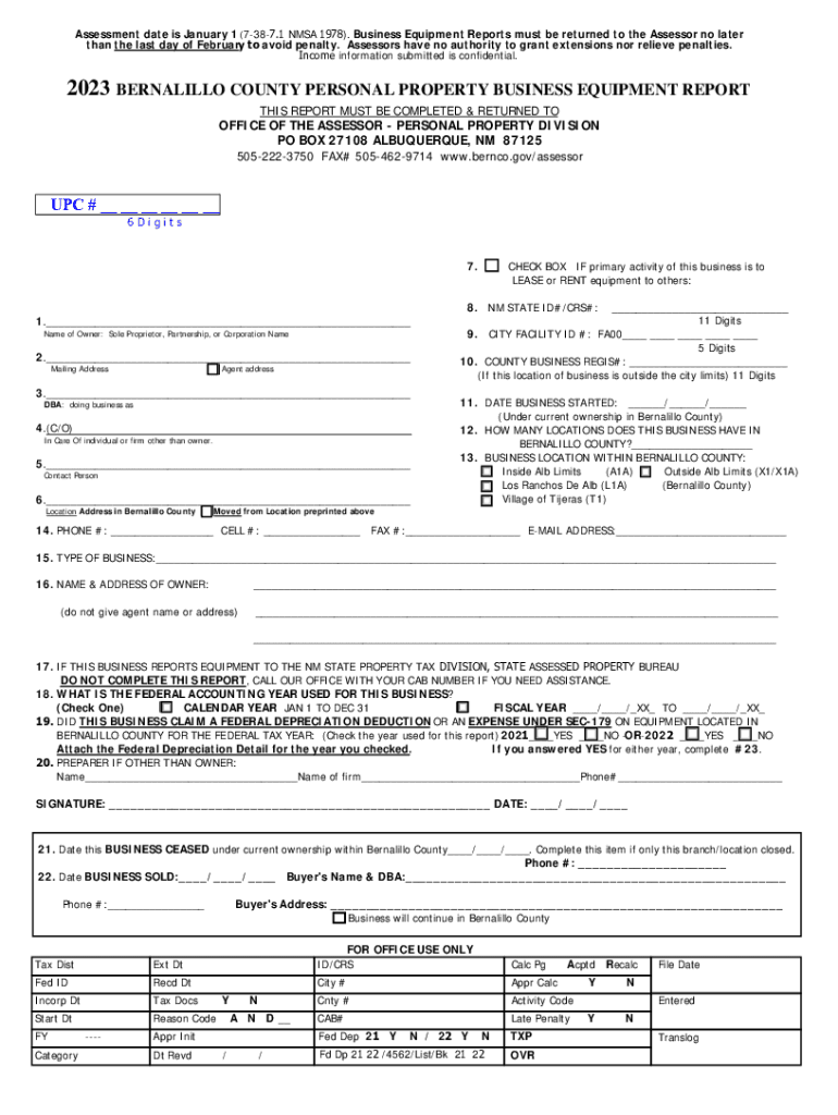 BERNALILLO COUNTY OFFICE OF THE ASSESSOR2023 PERSONAL PROPERTY BUSINESS EQUIPMENT Reporter Business Property Owner: Business personal property (equipment) that is located in Bernalillo County on January