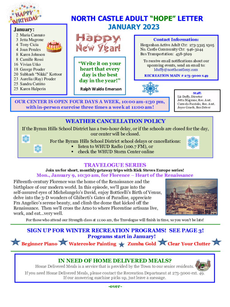 NORTH CASTLE ADULT HOPE LETTER JANUARY 2023January: 2 3 4 4 8 8 16 18 20 23 25 25Maria Cannot Jetty Marine Tony Cilia Joan Percales Karen Johnson Camille Rossi Vivian TKO George Powder Subhash Nikki