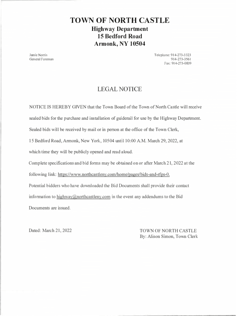 TOWN OF NORTH CASTLE Highway Department 15 Bedford Road Armonk, NY 10504Telephone: 9142733323 9142733561 Fax: 9142730839Jamie Norris General ForemanLEGAL NOTICE IS HEREBY GIVEN that the Town Board