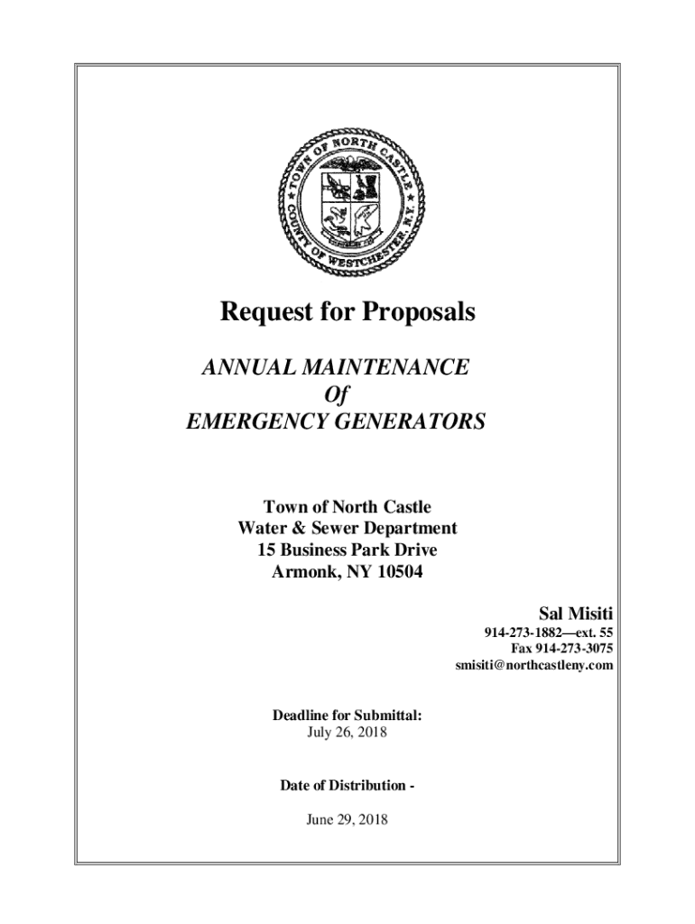 Request for Proposals ANNUAL MAINTENANCE Of EMERGENCY GENERATORSTown of North Castle Water & Sewer Department 15 Business Park Drive Armonk, NY 10504 Sal Visit 9142731882ext. 55 Fax 9142733075 smisiti@northcastleny.comDeadline